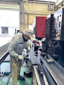製造部門で長年活躍されている岡松さんに、現場の変化についてお話を伺いました。 なんと岡松さんは社歴27年!昔は、アングルやパイプのカットをすべて手作業で行っていたそうです。 「当時は寸法を測って、手で切るのが当たり前でした。でも今は、良い機械が導入されて、作業効率がぐんと上がりました。」と岡松さん。 現在は、カットしたい寸法を機械に入力するだけで、機械が自動でカットしてくれます。