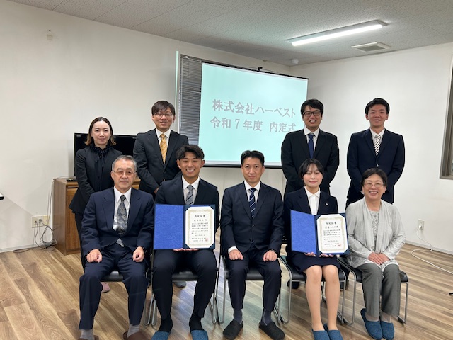 🌸株式会社ハーベスト 令和7年度 内定式を開催しました🌸 10月1日(火)、株式会社ハーベスト本社にて令和7年度の内定式を執り行いました。 当日は、社長・会長をはじめとする役員・専務・先輩社員が出席し、内定者2名を温かく迎えました。 式では社長からの歓迎の挨拶、内定証書の授与、内定者からの挨拶、先輩社員による歓迎の言葉などが行われ、終始和やかな雰囲気の中で進行しました。 内定者の皆さんは、緊張の中にも社会人としての第一歩を踏み出す決意を感じさせる表情で、式に臨んでいました。式後には昼食会も開催され、社員との交流を深める貴重な時間となりました。 今後の成長と活躍を心より期待しています。